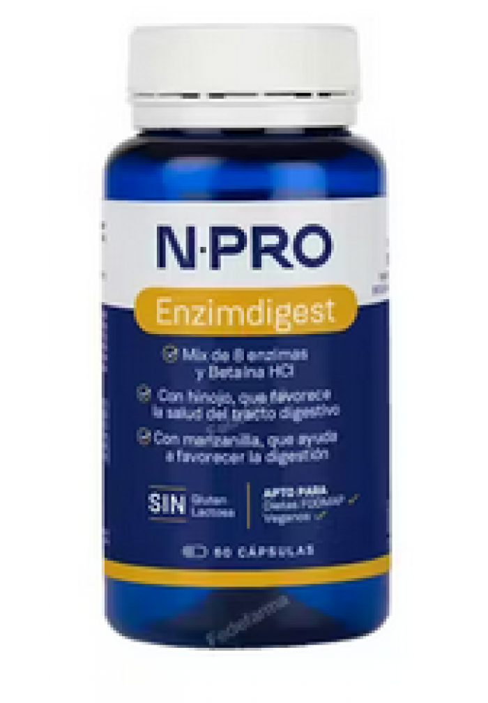 NPro Enzim digest es un producto útil en dietas en las que es necesario un aporte extra de proteínas, deportistas, déficits alimentarios. Propiedades y beneficios de las pastillas digestivas NPro Enzimdigest: Está formulado con enzimas de procedencia vegetal y fermentativa, que ayudan a la normal asimilación de carbohidratos, grasas y proteínas, por lo que brinda apoyo para el normal mantenimiento del tracto gastrointestinal. También está compuesto por Betaína HCI natural, la cual se encuentra en alimentos como la remolacha y es conocido por sus propiedades para ayudar a la digestión. Este compuesto es considerado una forma natural de apoyo al mantenimiento del equilibrio de pH en el estómago y el tracto intestinal, lo que ayuda a una normal absorción de vitaminas y minerales.